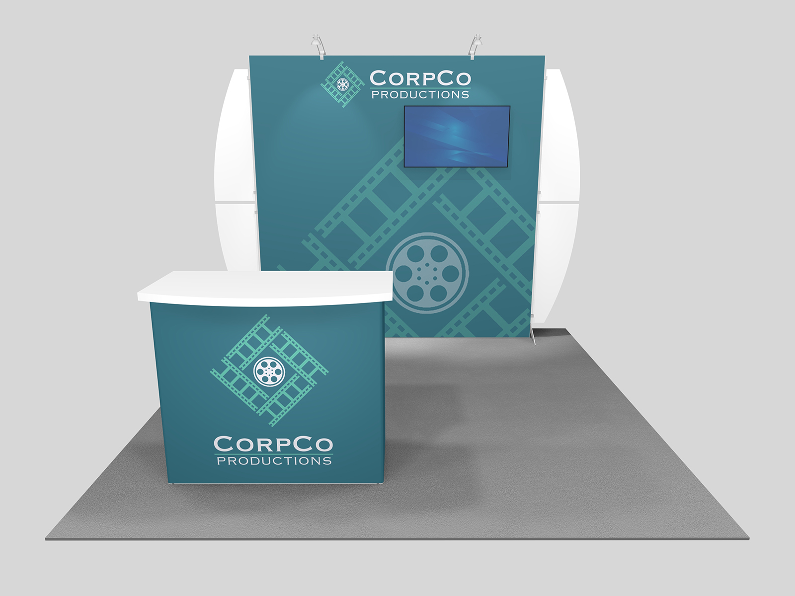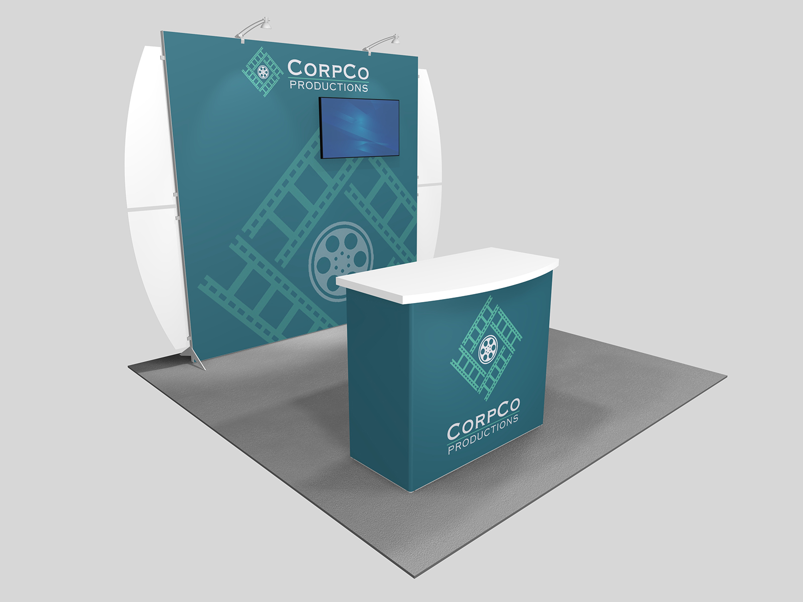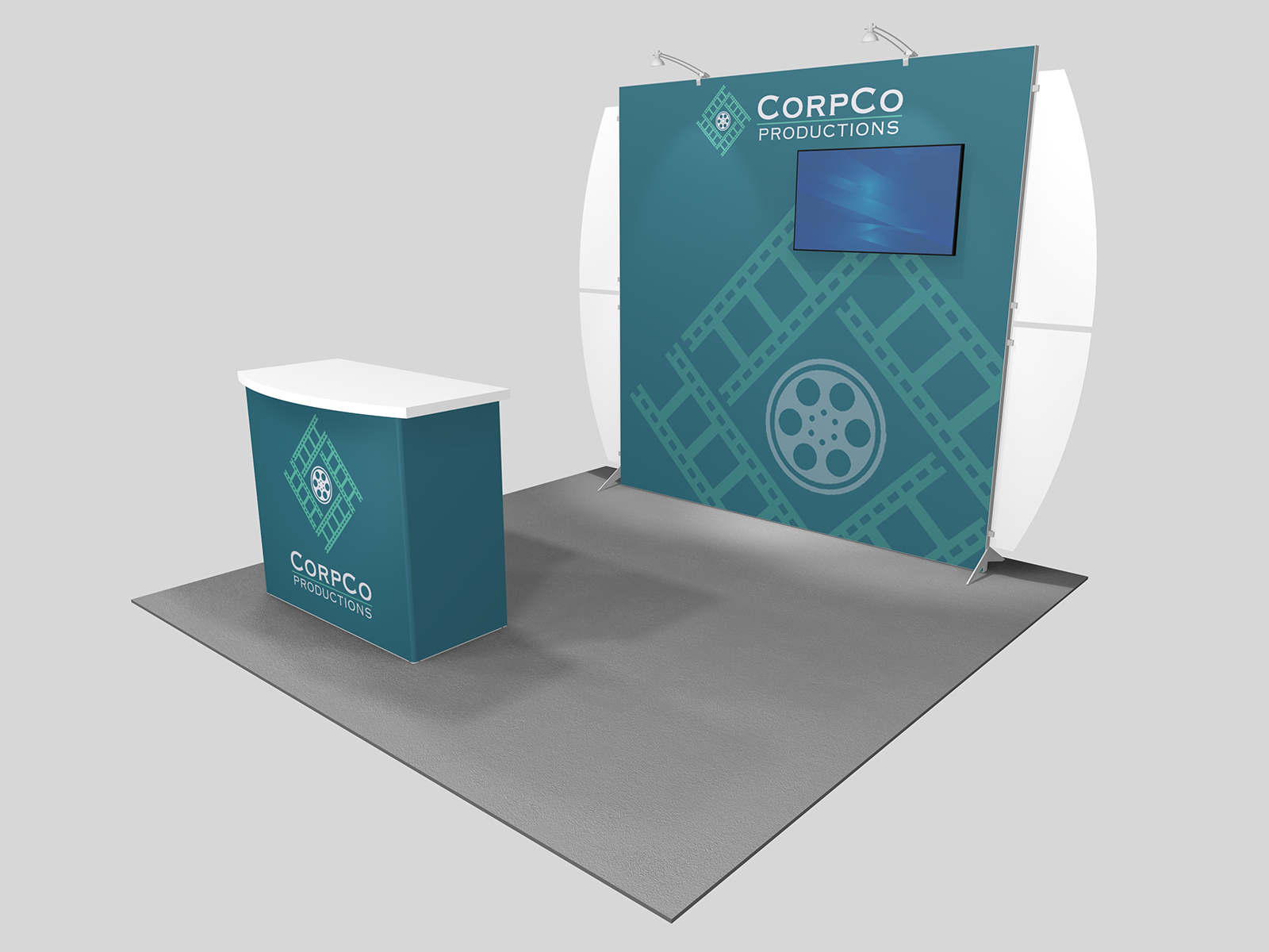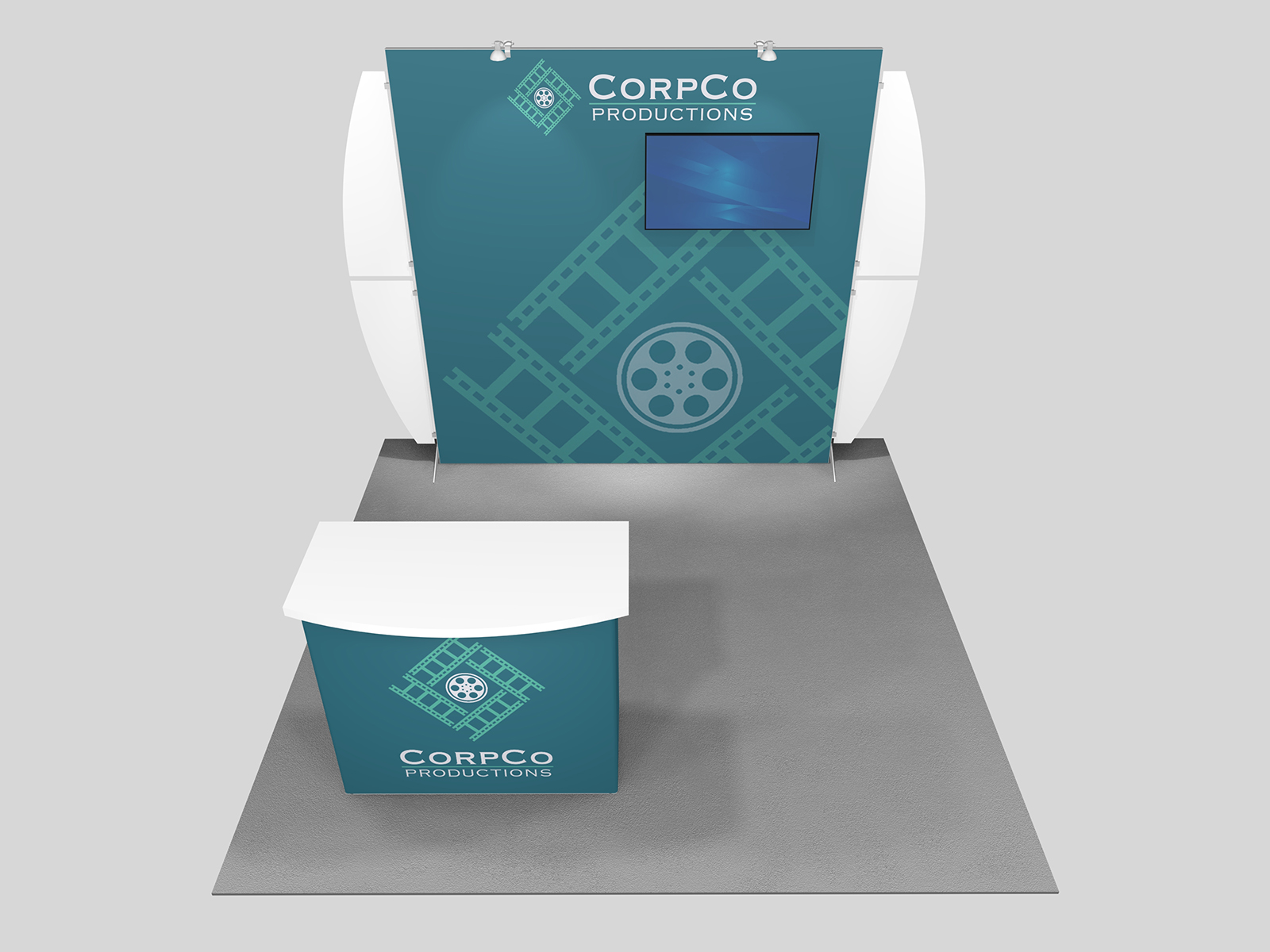 Quite often, a few custom elements added to the design can give the entire design a custom look even if it’s as simple as some colorful laminated workstations, shelves, or a reception counter. Custom laminated soffits and backlighting are also nice touches that are inexpensive and well worth the investment. As a bonus, if you re-rent the same exhibit, your second rental will most likely be less expensive, since your first rental covered the cost of those custom components.